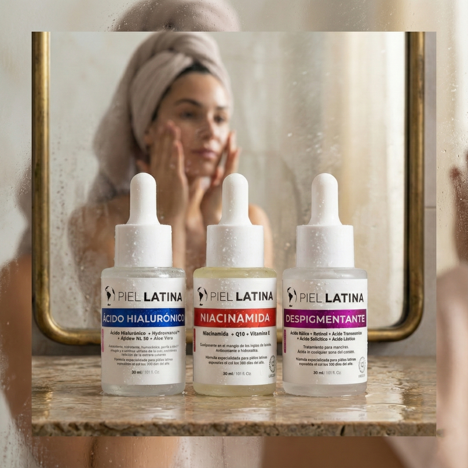 Este kit combina la potencia del Tónico Despigmentante, el equilibrio del Sérum de Niacinamida + Q10 y la hidratación profunda del Ácido Hialurónico.