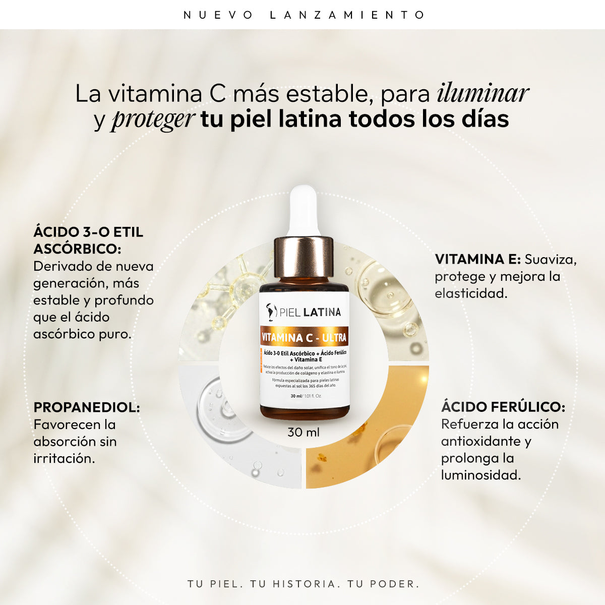 Formulado con Vitamina C estabilizada (3-O-Ethyl Ascorbic Acid), Vitamina E, Ácido Ferúlico y Propanediol, este sérum actúa como un antioxidante de nueva generación, clínicamente probado para:
